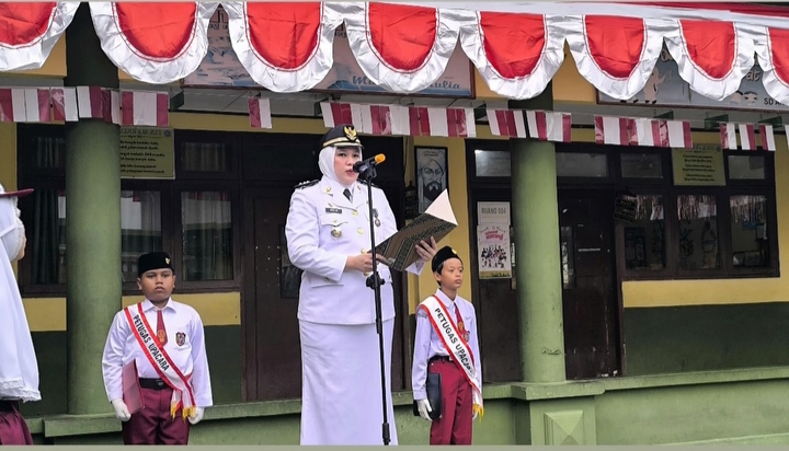 Pekanbaru - Camat Pekanbaru Kota Rein Rizka Karvy, S.STP.,M.Si memimpin upacara peringatan HUT ke-80 Kemerdekaan Republik Indonesia di SD An Nur Pekanbaru, Minggu (17/8/2025).