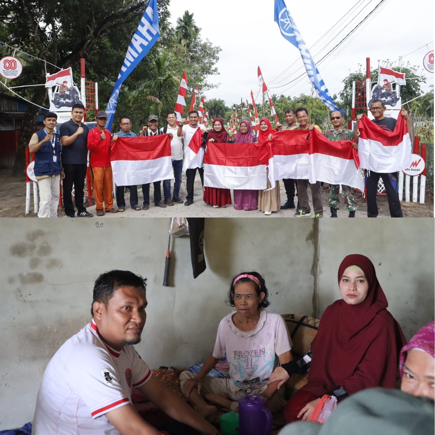 Kegiatan gotong royong merah putih di pusatkan di Masjid Al Mukminin Jalan Seroja kemudian di lanjutkan pembagian bendera dan bakti sosial berupa penyerahan paket sembako kepada masyarakat secara spontan di salah satu rumah warga RW 11 Ibu Suryani (60) hanya tinggal bersama anaknya.