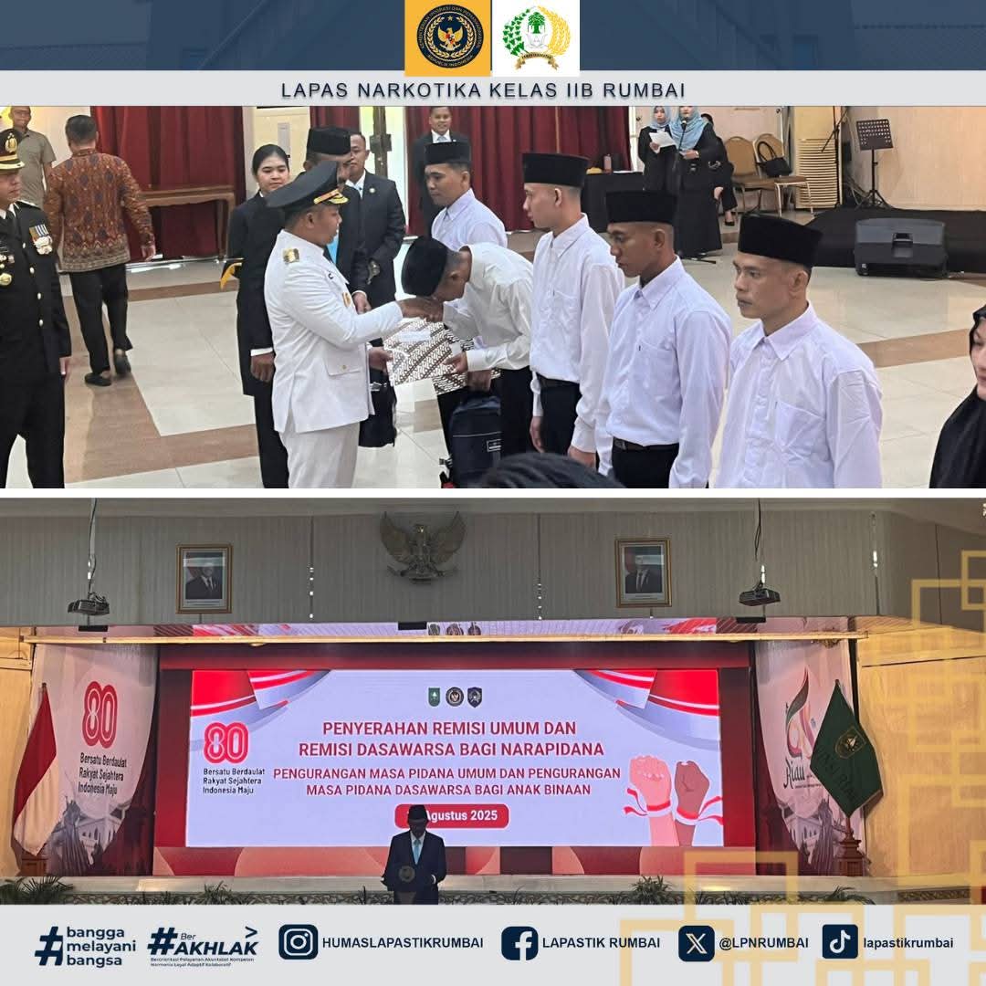 Pekanbaru - Hari ini merupakan hari yang spesial bagi seluruh Bangsa Indonesia, dimana tepat hari ini 17 Agustus 2025, Indonesia merayakan Hari Kemerdekaan yang ke 80 Tahun. Tidak kalah menggembirakan juga 11.838 WBP menerima Remisi Umum (RU), sedangkan 11.636 WBP mendapatkan Remisi Dasawarsa sebagai wujud penghargaan atas prestasi, dedikasi, dan kedisiplinan mereka selama menjalani pembinaan di riau, pada Lapas Narkotika Kelas IIB Rumbai terdapat 1202 WBP yang mendapatkan Remisi Umum dan 1418