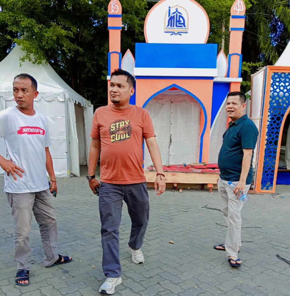 | Camat Kulim Fajri Adha didampingi Sekcam Peri Susanto dan Ketua Forum RT RW Suratno saat meninjau persiapan stand bazar di Lokasi MTQ tingkat Kota Pekanbaru, Kamis (30/10/2025) sore. |