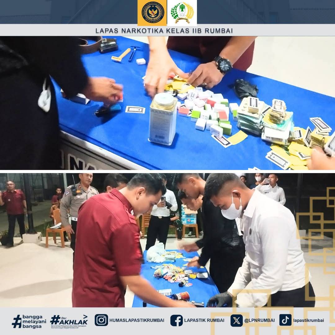Pekanbaru – Lembaga Pemasyarakatan (Lapas) Narkotika Kelas IIB Rumbai bersinergi dengan TNI dan Polri menggelar razia gabungan kamar hunian warga binaan pada hari Sabtu dini hari tepat pukul 00.00 WIB. Kegiatan ini merupakan wujud komitmen melaksanakan Arahan 13 (tiga belas) Program Akselerasi Menteri Imigrasi dan Pemasyarakatan khususnya pada poin 1 (satu) yakni Memberantas Peredaran Narkoba dan Pelaku Penipuan dengan berbagai modus di Lapas dan Rutan, Sabtu (11/10/2025).