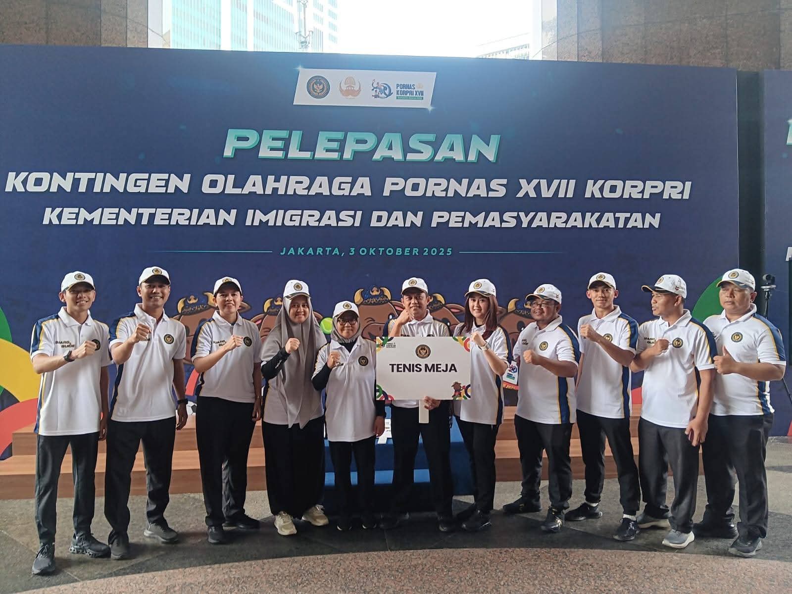 Jakarta - Menteri Imigrasi dan Pemasyarakatan, Agus Andrianto secara resmi melepas Kontingen Korps Pegawai Republik Indonesia (KORPRI) Kementerian Imigrasi dan Pemasyarakatan (Kemenimipas) yang akan mengikuti ajang Pekan Olahraga Nasional (PORNAS) XVII KORPRI, Jumat (3/10). Acara pelepasan berlangsung khidmat di lobi gedung Kemenimipas dengan dihadiri para pejabat eselon I, II, serta jajaran pengurus KORPRI Kemenimipas.
