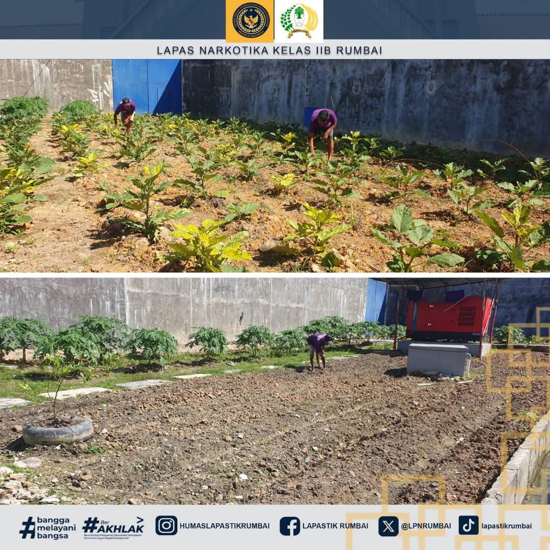Pekanbaru - Lembaga Pemasyarakatan Narkotika Kelas IIB Rumbai melakukan pembinaan kemandirian memberdayakan Warga Binaan Pemasyarakatan (WBP) untuk melakukan perawatan terhadap terong, pepaya madu hingga penanaman sayur pare, Selasa (12/8/2025).
