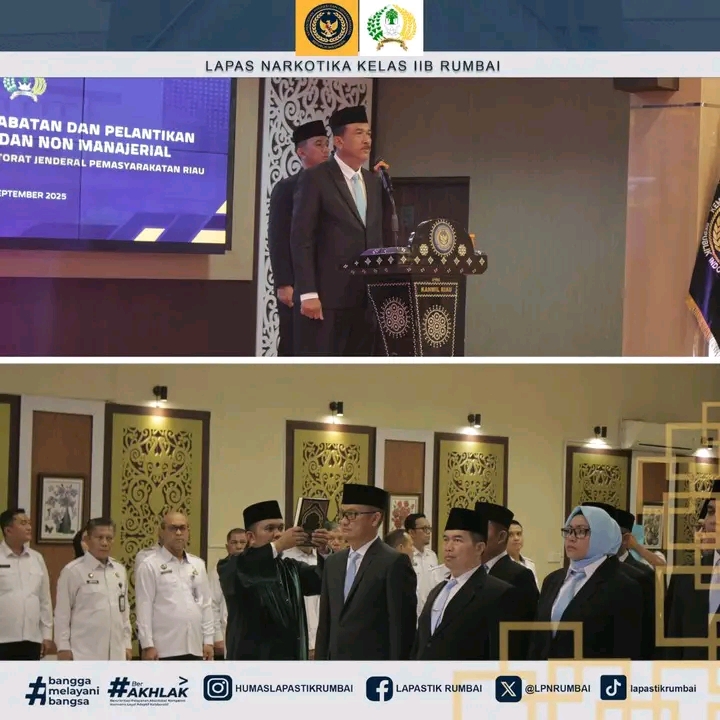 Pekanbaru-Kepala Kantor Wilayah Direktorat Jenderal Pemasyarakatan (Kanwil Ditjen PAS) Riau, Maizar, melantik sejumlah pejabat manajerial dan non manajerial di lingkungan pemasyarakatan wilayah Riau, Senin (29/09/2025).
