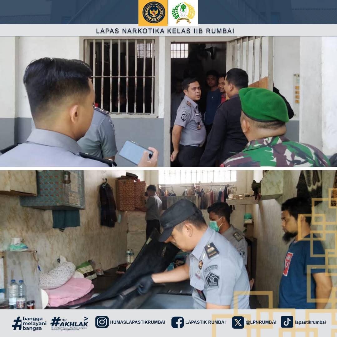 Pekanbaru - Lembaga Pemasyarakatan (Lapas) Narkotika Kelas IIB Rumbai terus tunjukkan komitmennya memberantas peredaran narkoba dan handphone sebagai wujud implementasi Program Akselerasi Menteri Imigrasi dan Pemasyarakatan. Hal ini dibuktikan melalui razia kamar hunian Warga Binaan bersama personel Polri -TNI dan, Senin (25/8/2025).
